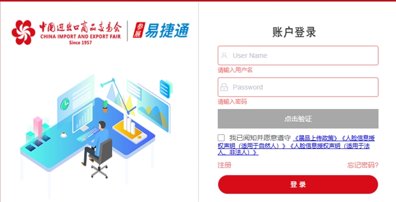 3.广交会参展企业(含出口展与进口展)无需注册,输入账号与密码(与申请展位的易捷通账号密码相同),点击登录。