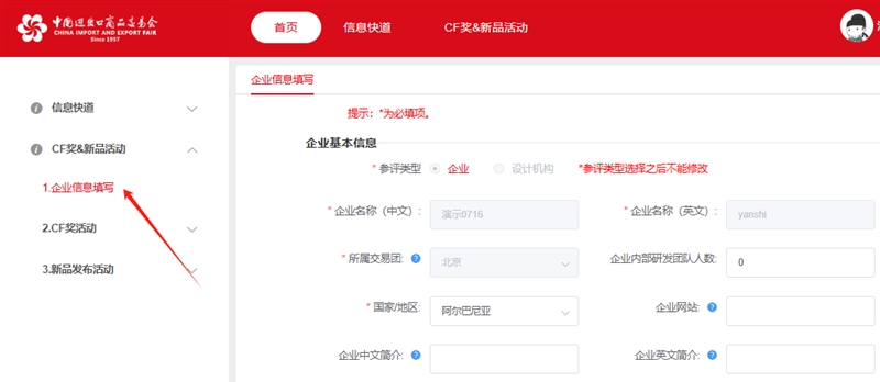 4.点击页面左侧菜单中CF奖&新品活动>1.企业信息填写,完善企业信息。