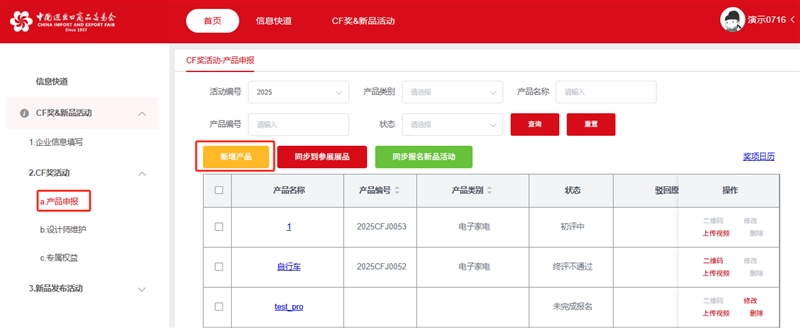 5.下一步,点击2.CF奖活动>a.产品申报>新增产品。