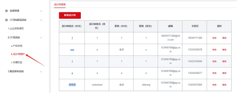 12.若需修改设计师相关信息,请点击左侧菜单中2.CF奖活动>b.设计师维护,新增或修改设计师信息。